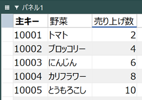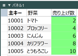 例えば、このように5種類の野菜の売り上げ表があったとして、売り上げ数が2個以上では緑色、5個以上では黄色、10個以上では赤色で表示させたいとしましょう。