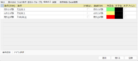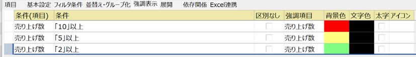 10個以上売れたデータは赤、5~9個は黄、2~4個は緑というように、希望通りの表示になっています。