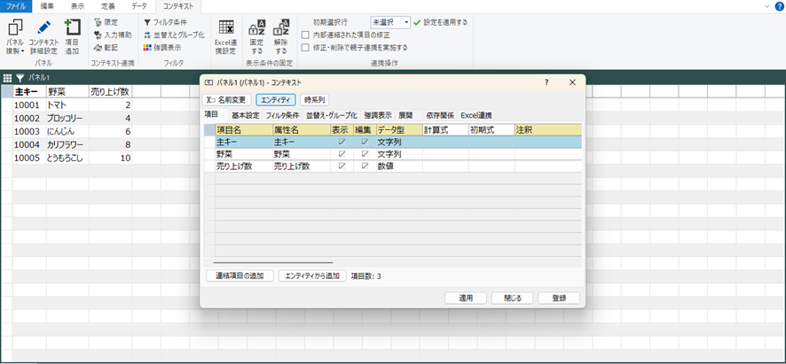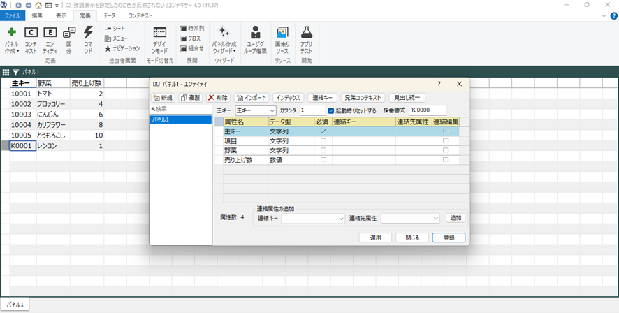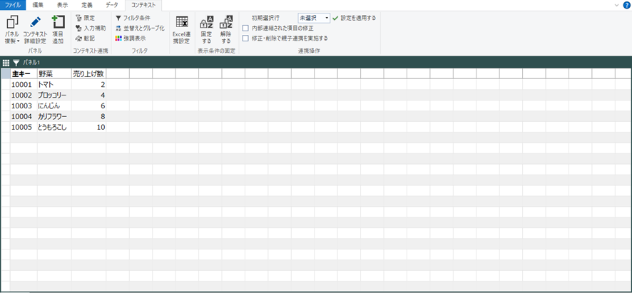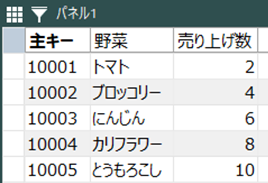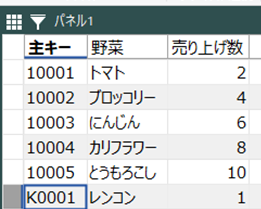 例えば、パネル1には次のような野菜の売り上げ表があったとします。このパネルの主キーを「10001」ではなく、「K0001」という表示に変えてみましょう。