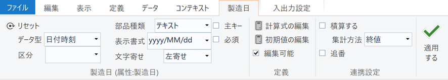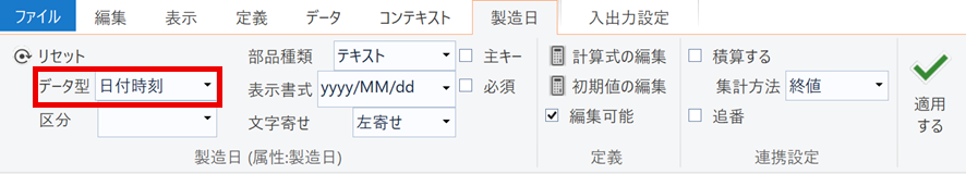 他のエンティティから連結した項目「製造日」がデータ型「文字列」になっていたから「日付時刻」に変更したい!