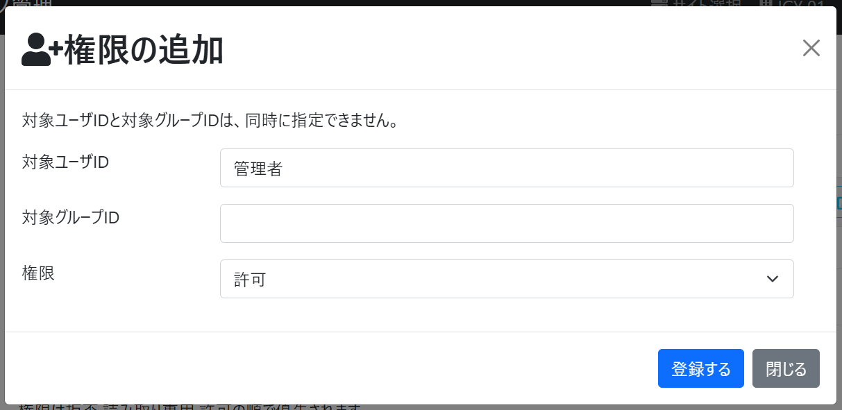 「権限の追加」で対象となるユーザやグループに権限を付与できます。