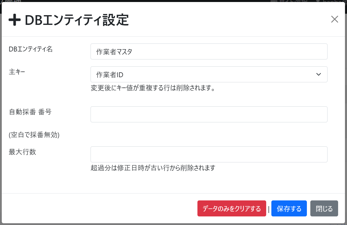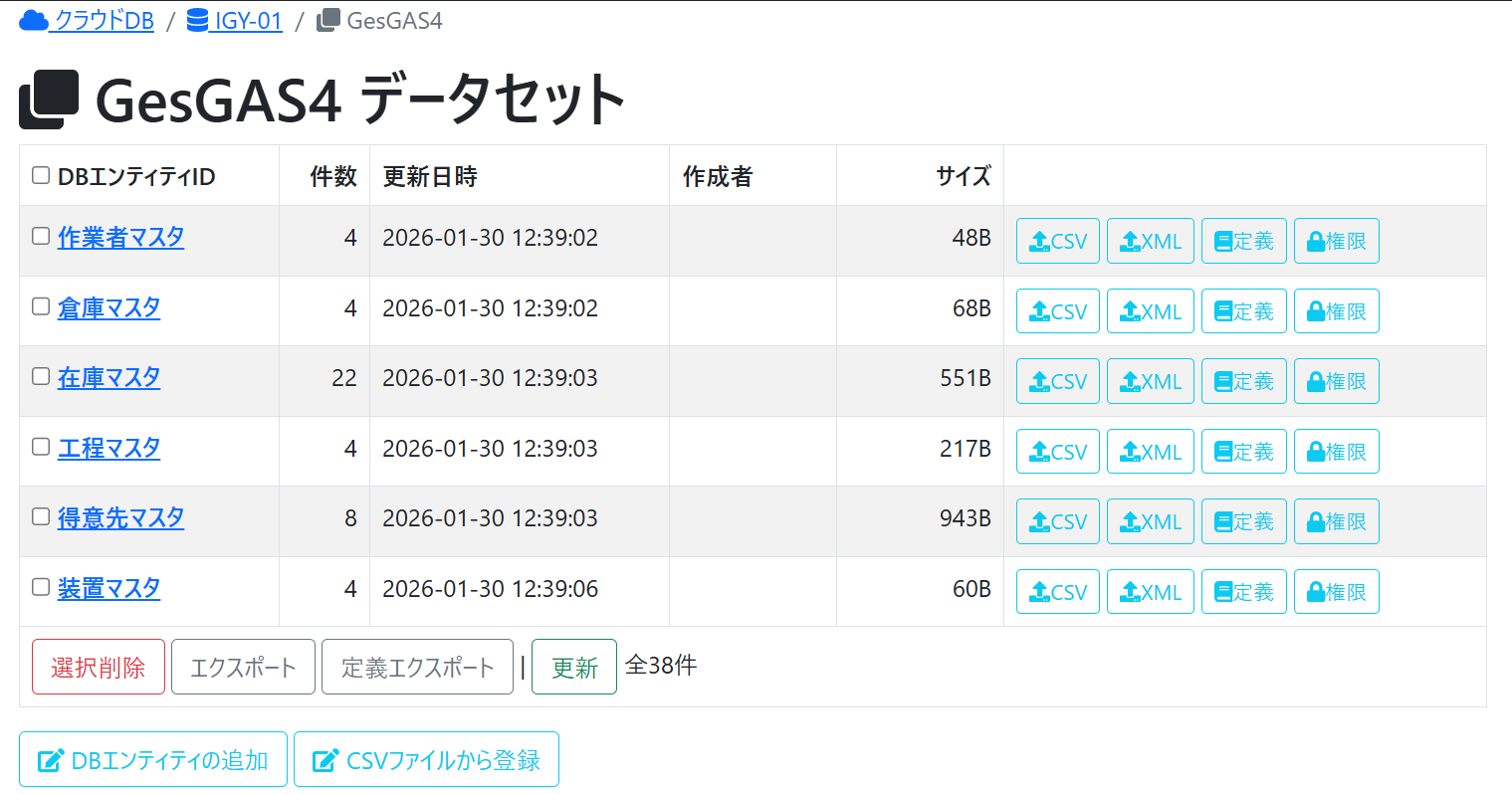 | CSVファイルから登録 | CSVファイルから同名のDBエンティティと内容を作成します。CSVファイル名と同一のDBエンティティがすでに存在する場合は、それらがすべて削除されてから保存されます。 |