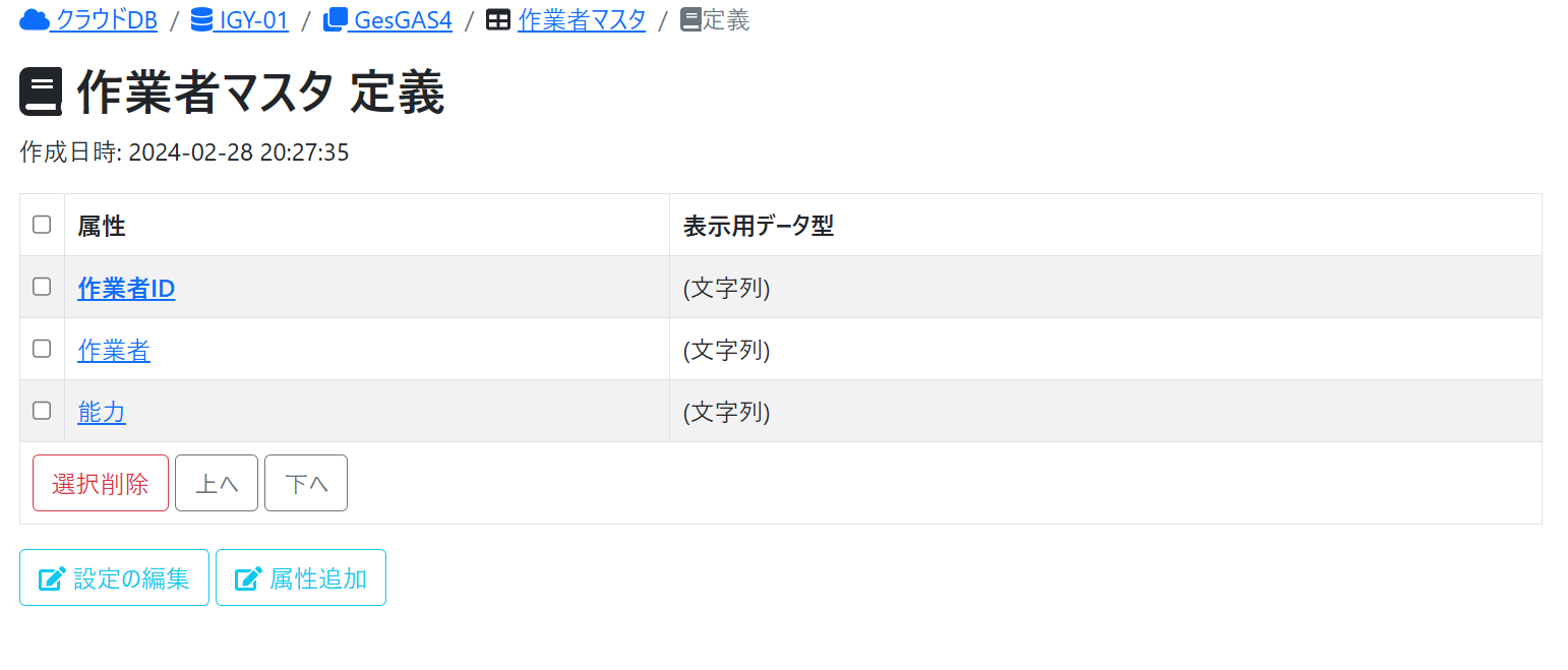 | [選択削除]ボタン | チェックした属性を完全に削除します。この操作でレコード中の属性に対応する内容も削除されます。 |