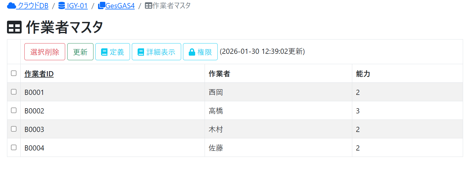 | [選択削除]ボタン | DBエンティティのレコードの内、チェックで選択したレコードを削除します。 |