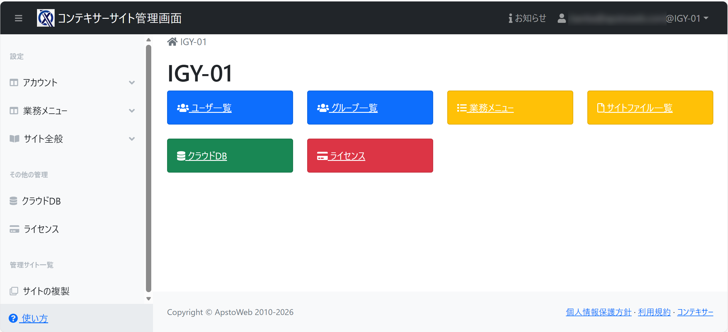 サイト管理ページは次のアドレスからアクセスできます。なお管理ページにアクセスできるのは、サイト管理の権限が付与されたAW-IDのみです。既定ではご契約担当者のメールアドレスに付与されています。