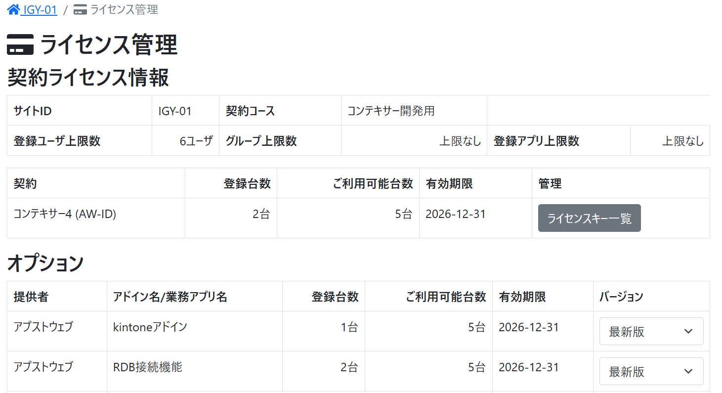 | [ライセンスキーの追加] | ライセンスキーを新しく発行します。契約コースのユーザ数に応じて、ライセンスキーの発行上限数まで発行できます。一度発行されたライセンスキーは削除できません。 |