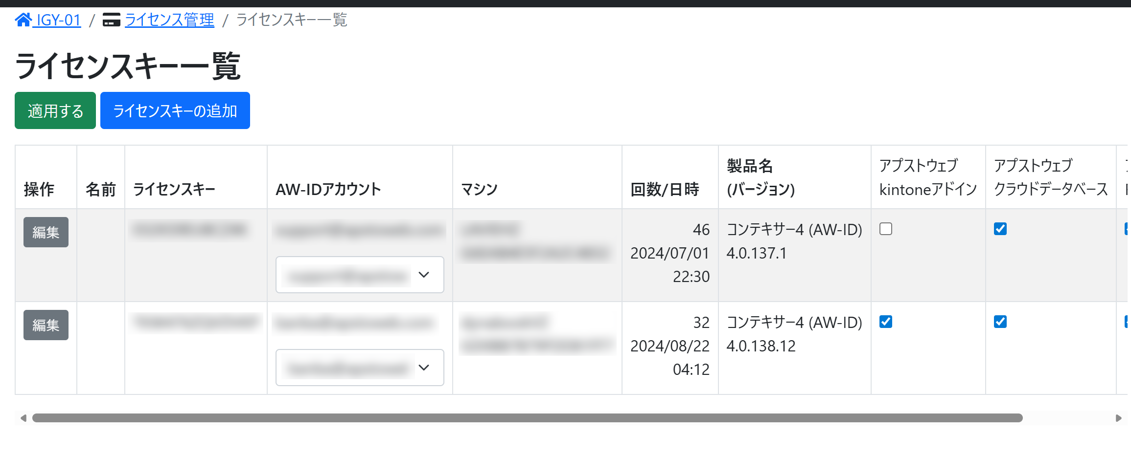 契約ごとにライセンスキーの一覧が表示されます。一覧には、ライセンスキーと使用しているマシンの情報が表示されます。