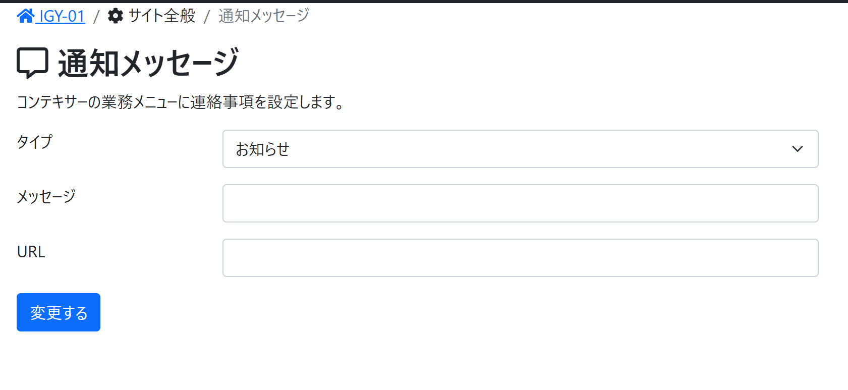 サイトにログインした担当者のコンテキサー上で通知するメッセージを設定できます。業務アプリに変更がある時など、利用者に連絡手段として利用できます。