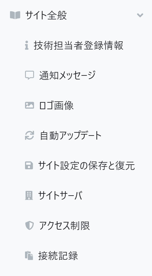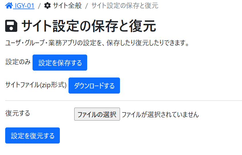 | 設定を復元する | ダウンロード済みのサイト設定ファイル(xmlファイル)をこのサイト管理ページの設定として復元します。現在のサイト設定は削除され上書きされます。 |