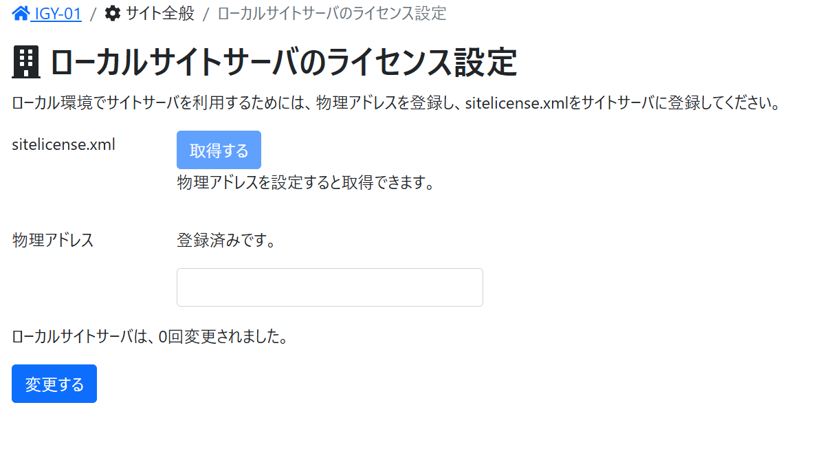 ローカルネットワークにサイトサーバを設置する場合に、この設定画面にてサイトサーバの設置に必要な情報を設定・取得します。なお、ローカルサイトサーバの利用には、オプション契約が必要です。