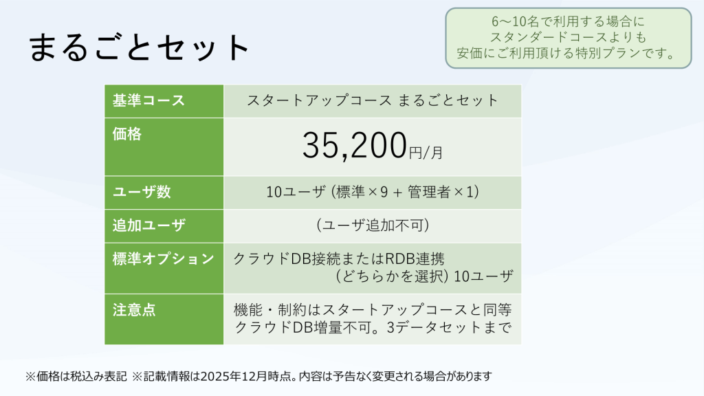 スタートアップコース「まるごとセット」スタートアップコースを最大10名でご利用頂ける特別なセットプランをご用意いたしました。このセットでは、クラウドDBまたはRDB連携のどちらかの人数分ライセンスを選択でき、標準的な利用方法なら定額で分かりやすいプランです。最大10ユーザの同時利用が可能ですので、より多くの従業員と情報共有できます。本セットのご契約をご希望の場合は、お問い合わせフォームからお申し込みください。